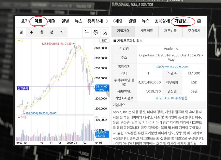 투자할 해외 종목을 선택할 때 차트와 기업정보도 참고하세요. 지금까지 가격 변동 흐름이 어떻게 되었는지 알면 사는 가격을 정할 때 도움이 될 거에요. 기업정보를 통해 얼마나 기업이 튼튼한지 알아보는 것도 좋고요.