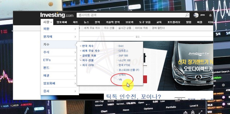 베트남 증시 지수를 확인하기 위해서는 메뉴에서 [시장]을 클릭한 후 [VN]을 클릭해 주세요.