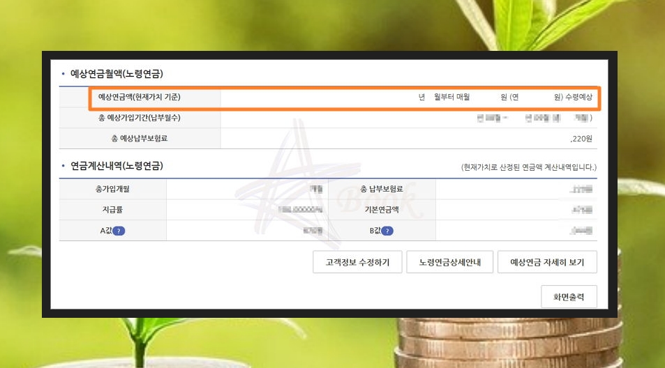 마지막으로 전체 납부액을 토대로 받을 수 있는 국민연금의 금액을 확인할 수 있어요. A값과 B값으로 구분이 되는데요. A값의 경우에는 연금수급 직전 3년간 가입자 전체에 대한 평균소득의 평균액이에요. B값의 경우에는 가입기간 동안 본인의 월 소득역의 평균을 말하고요. 예상금액을 보면 매월 얼마나 수령할 수 있는지 확인할 수 있어요.