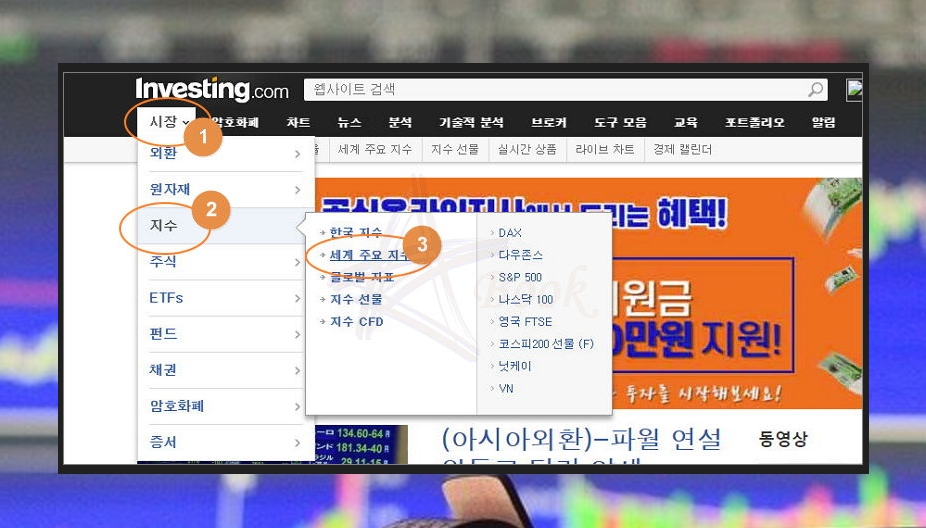 여기서 미국의 다우지수를 보는 방법은 간단해요. 메뉴에서 [시장]과 [지수]를 클릭하면 바로 나와요. 다우 외에 S&P500, 나스닥도 실시간으로 확인이 가능해요.