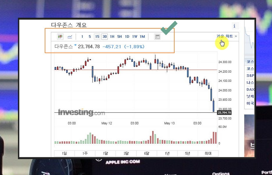 국내외 주식 시세나 경제 지표를 확인할 수 있는 인베스팅을 통해 미국 실시간 다우지수를 확인해 볼게요. 로그인을 하지 않아도 되고, 무료로 사용할 수 있는 사이트에요. 시세는 물론이고, 차트, 최신 뉴스, 기술적 분석 자료에 대한 정보도 얻을 수 있어요.