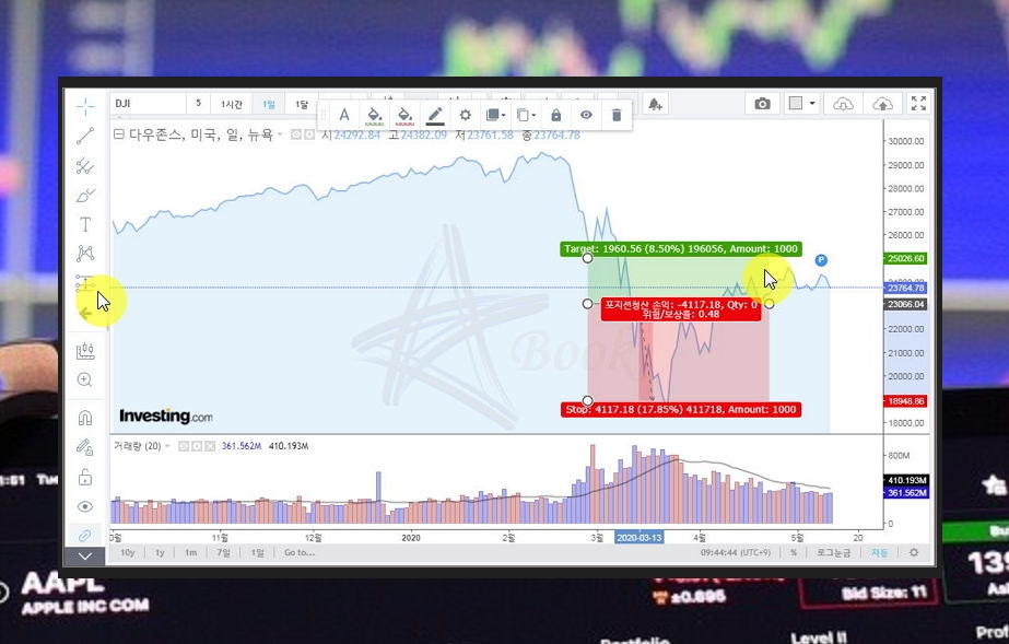 기술 차트를 사용하면 모니터 화면에 꽉 차도록 그래프를 볼 수 있어요. 다우지수의 흐름을 분석하거나 예측하고 싶을 때 좋아요. 좌측에 마련되어 있는 추세선, 범위 계산 등의 도구도 함께 사용해 보세요.
