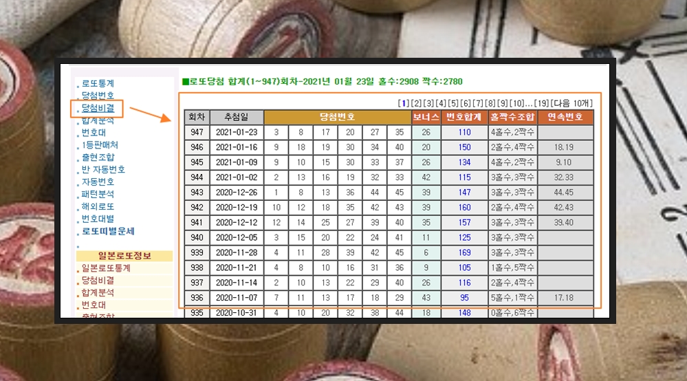 로또 게시판 페이지에는 다양한 통계 자료와 유용한 정보가 많이 있어요. 좌측에 있는 메뉴에서 당첨비결을 클릭해 보세요. 그럼 매회 당첨 및 보너스 번호, 합계, 홀짝수조합, 연속되는 숫자와 같은 정보를 얻을 수 있어요.