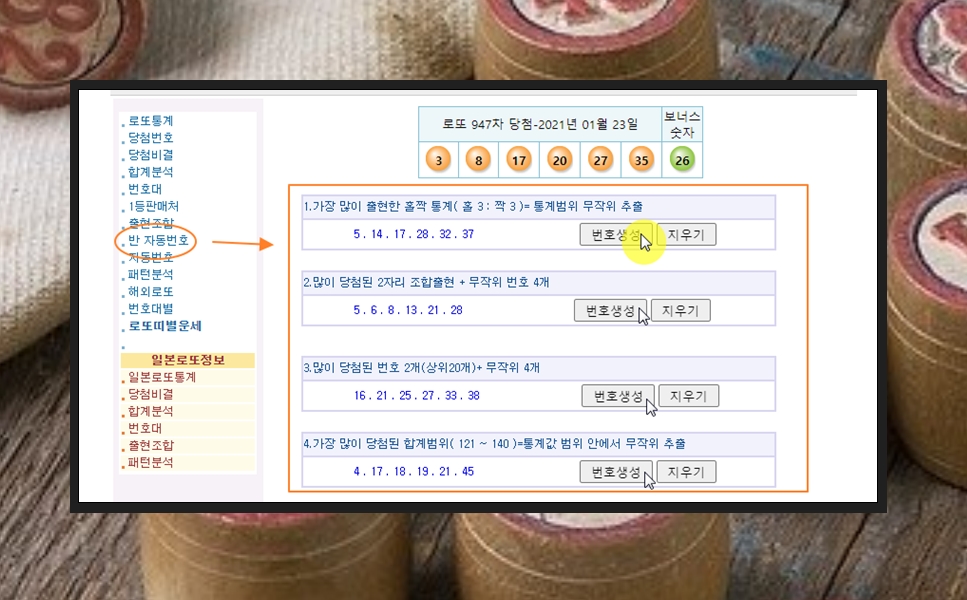 본격적으로 로또복권에 사용할 숫자를 추천 받아볼게요. 좌측 메뉴에서 "반 자동번호"를 클릭해 보세요. 해당 서비스를 이용하면 확률적으로 당첨 확률이 높은 번호를 무료받기 할 수 있어요. 가장 많이 출현한 홀짝 통계, 많이 당첨된 2자리 조합출현, 많이 당첨된 숫자, 가장 많이 당첨된 합계범위 등이 보이실텐데요. 옆에 있는 "번호생성" 버튼을 클릭해 보세요. 그럼 새로운 숫자로 구성된 것을 무료받기를 할 수 있어요.