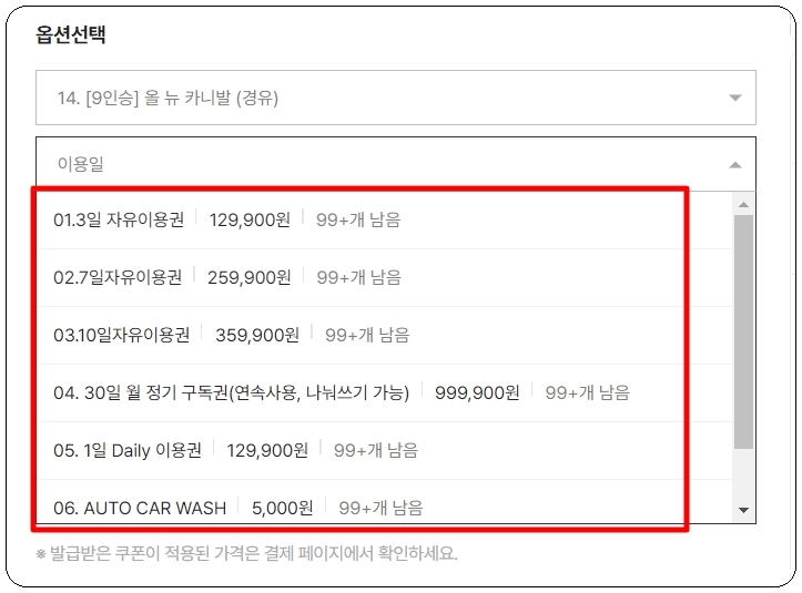 제가 선택한 판매 글에서 옵션을 선택해 보겠습니다. 카니발 외에 싼타페, 스포티지, 티볼리, 스타렉스 등 다양한 차종을 선택할 수 있게 되어 있는데요. 저는 9인승 올 뉴 카니발을 선택했습니다. 휘발유가 아닌 경우가 들어간다는 점도 꼭 기억해 주세요. 간혹 렌트 차량을 이용할 때 제대로 된 연료를 넣지 않아서 문제가 생기는 경우가 있거든요. 그 다음에는 기간을 선택할 차례인데요. 1일, 3일, 7일, 10일, 30일과 같이 여러 기간을 선택할 수 있고, 그에 따른 비용도 정확하게 확인할 수 있습니다.