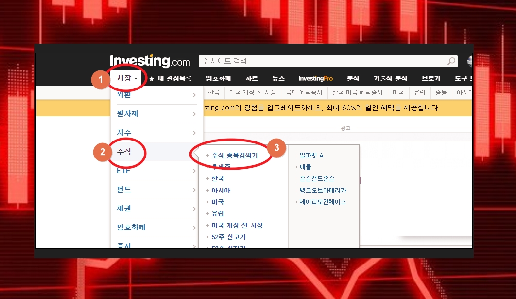 이번에는 개별 종목에 대한 정보를 신속하고 정확하게 확인하는 정보를 알려 드리겠습니다. 메뉴에서 [시장] [주식] [주식 종목 검색기]를 차례대로 클릭해 주세요.