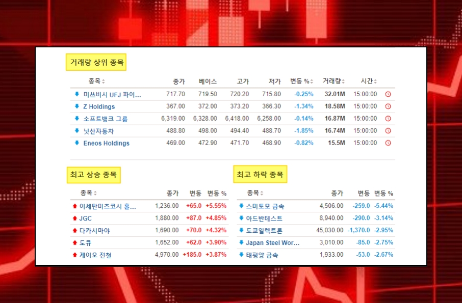일본 주식시장에서 거래량이 가장 많은 종목, 최고로 시세가 상승한 종목, 반대로 최고로 하락한 종목에 대한 내용도 확인이 가능합니다. 여기에 나와 있는 표는 주식 시장이 열렸을 때 실시간으로 시세와 거래량 등이 반영이 됩니다.