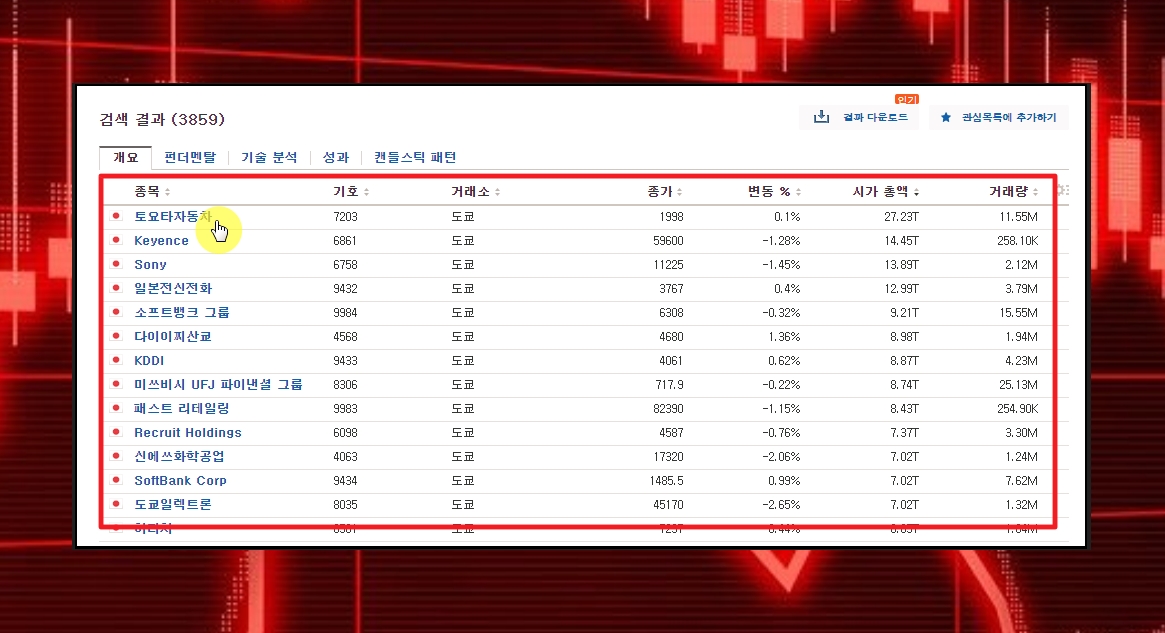 검색 결과가 나왔습니다 3859개의 일본 주식 시장에서 거래되는 종목을 확인할 수 있는데요. 이에 대한 실시간 시세를 확인하는 것은 물론이고, 펀더멘탈, 기술분석, 성과, 캔들스틱 패턴과 같은 정보도 확인이 가능합니다.