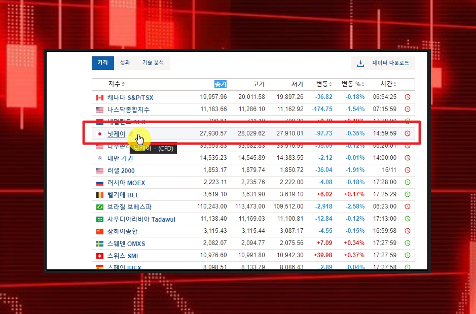 [세계 주요 지수] 페이지가 열렸습니다. 여기에서는 일본 증시뿐만 아니라 캐나다, 미국, 네덜란드, 대만, 러시아, 벨기에, 브라질 등 여러 나라의 증시에 대한 실시간 시세를 제공하고 있습니다. 여기에서 지수를 표로 볼 수 있는데요. 좀 더 상세하게 조회하기 위해서는 표에서 [니케이]를 클릭하면 됩니다.
