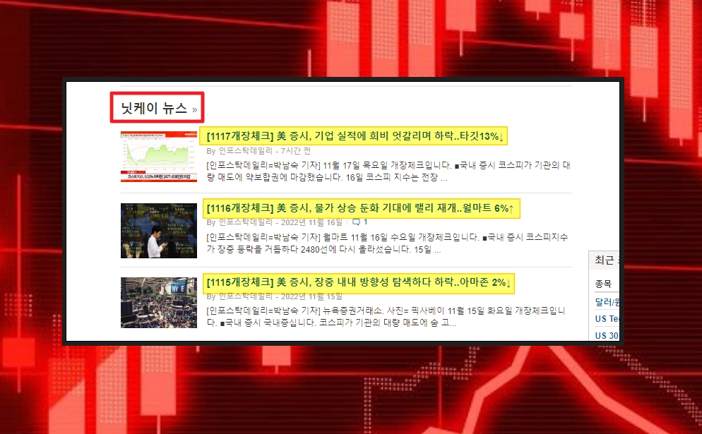 니케이 지수에 대한 페이지가 열렸습니다. 앞서 확인했던 것과 같이 차트와 시세 정보가 나타나는데요. 그 다음으로 눈여겨볼 만한 것은 뉴스입니다. 일본 증시 상황에 대한 여러 가지 정보를 알려 주는데요. 내용이 알차고, 실시간 수준으로 업데이트가 됩니다.