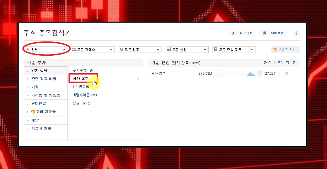 주식 종목 검색기 페이지가 열렸습니다. 좌측 상단에 있는 실렉트 박스에서 나라명을 [일본]으로 변경 해주세요. 그 아래에 있는 기준 부분에 있어서는 인기 항목에 있는 시가총액을 선택해 주세요. 종목 검색기에 익숙해지면 추가로 주가수입비율, 1년 변동률, 배당수익률 등 여러 가지 기준을 사용해 보는 것도 좋아요.