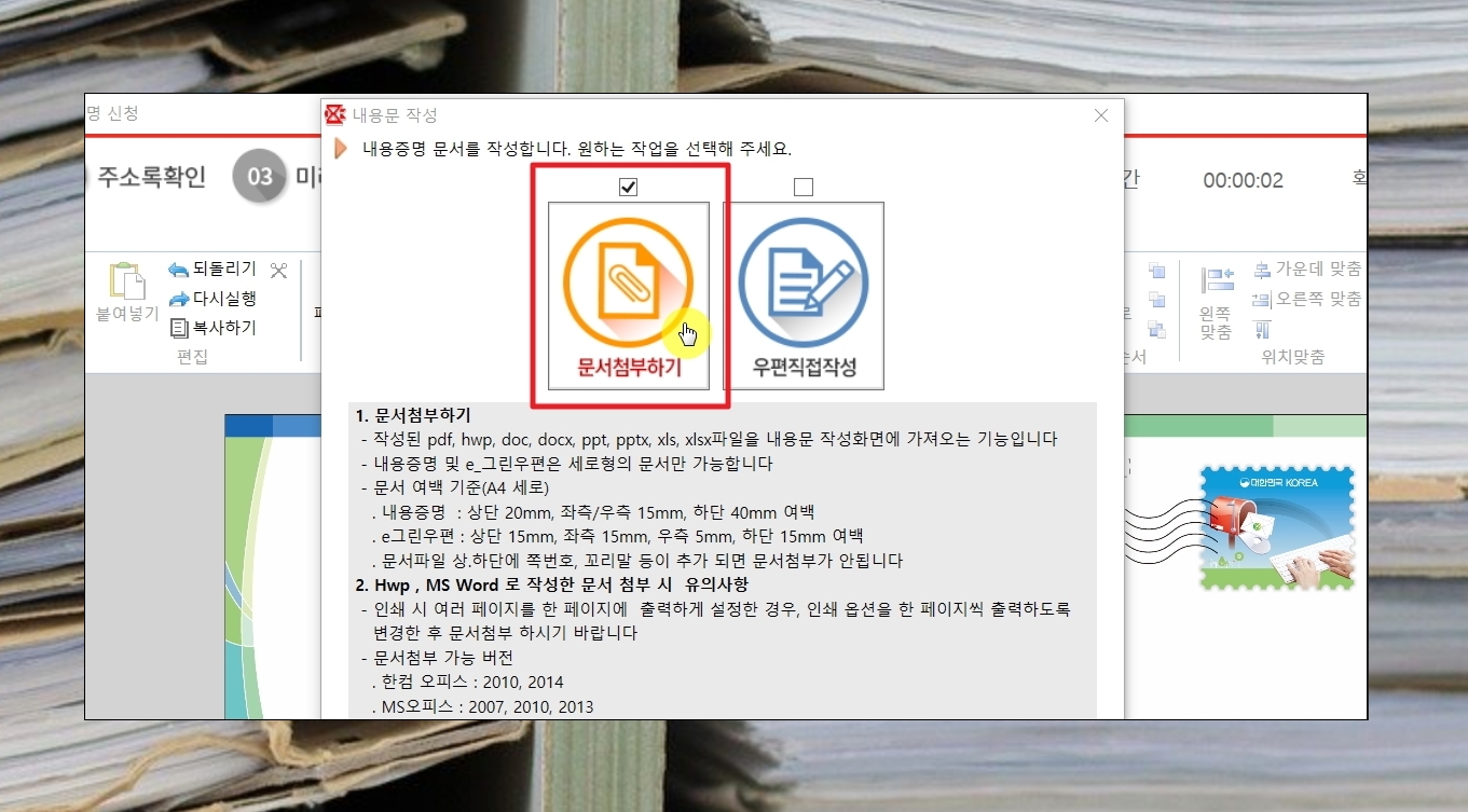 새롭게 열린 페이지에서 내용은 작성 창이 열립니다. 여기에서 원하는 작업을 선택해야 하는데요. [문서 첨부하기]와 [우편 직접 작성하기] 이렇게 두 가지가 있습니다. 여기에서 제가 알려드린데로 문서를 써 놓았다면 해당 문서 파일을 가지고 있을 겁니다. 이것을 가지고 첫 번째 작업을 진행하면 됩니다.