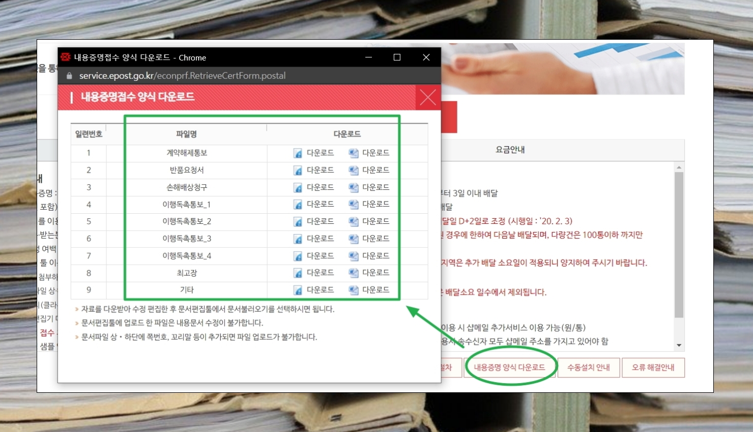 이곳에서 간단하게 내용증명 작성방법을 알아볼 수 있습니다. 우측 하단에 있는 [양식 다운로드] 버튼을 클릭해 보세요. 그럼 새로운 창이 열리면서 여러 양식이 나타납니다. 제목을 보면 알 수 있듯이 각 상황에 따라 사용하면 좋은 여러 양식이 마련되어 있습니다.
