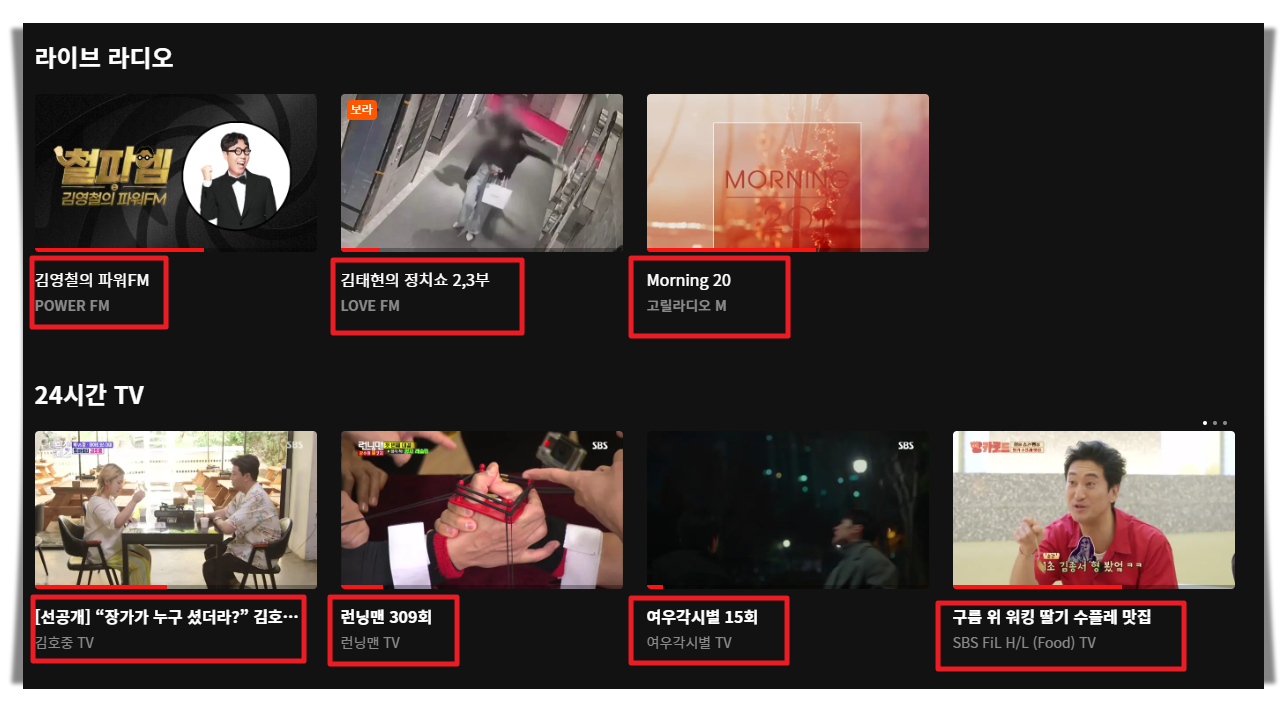 그럼 현재 tv에서 방영이 되고 있는 라이브 방송 목록이 나타납니다.