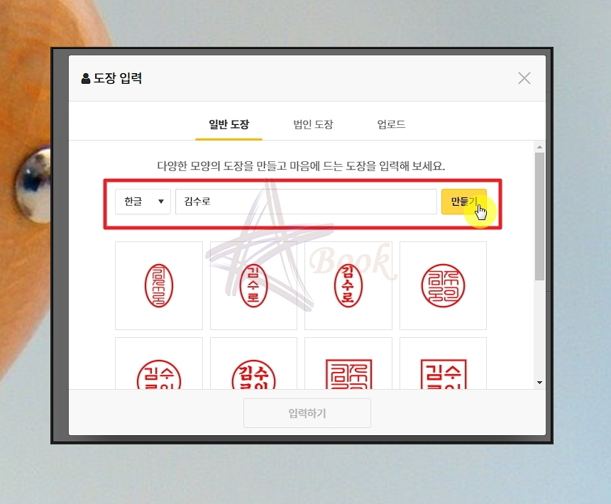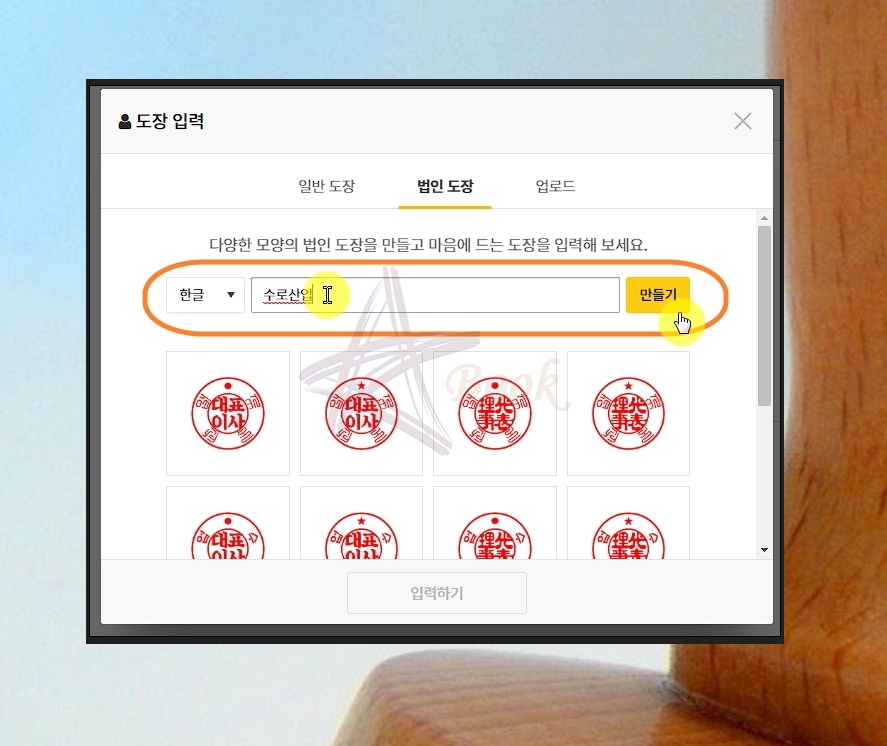법인용 도장을 만드는 것도 가능한데요. 이 또한 일반 버전과 만드는 방식이 동일합니다. 회사의 이름을 입력한 후 [만들기] 버튼을 눌러보세요. 법인에서 사용하기에 적절한 디자인이 많이 나타납니다.