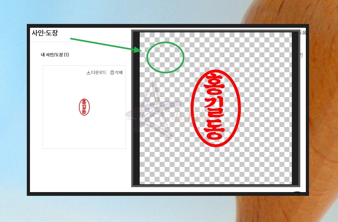 다음 화면은 제가 방금 제작한 도장 이미지 파일에 대한 것입니다. 이름을 프로그램에 입력한 후, 원하는 디자인을 선택하면 다음과 같은 이미지 파일을 얻을 수 있는데요. 이렇게 얻은 파일을 열어보면 "배경이 투명인 이미지 파일"임을 알 수 있습니다.