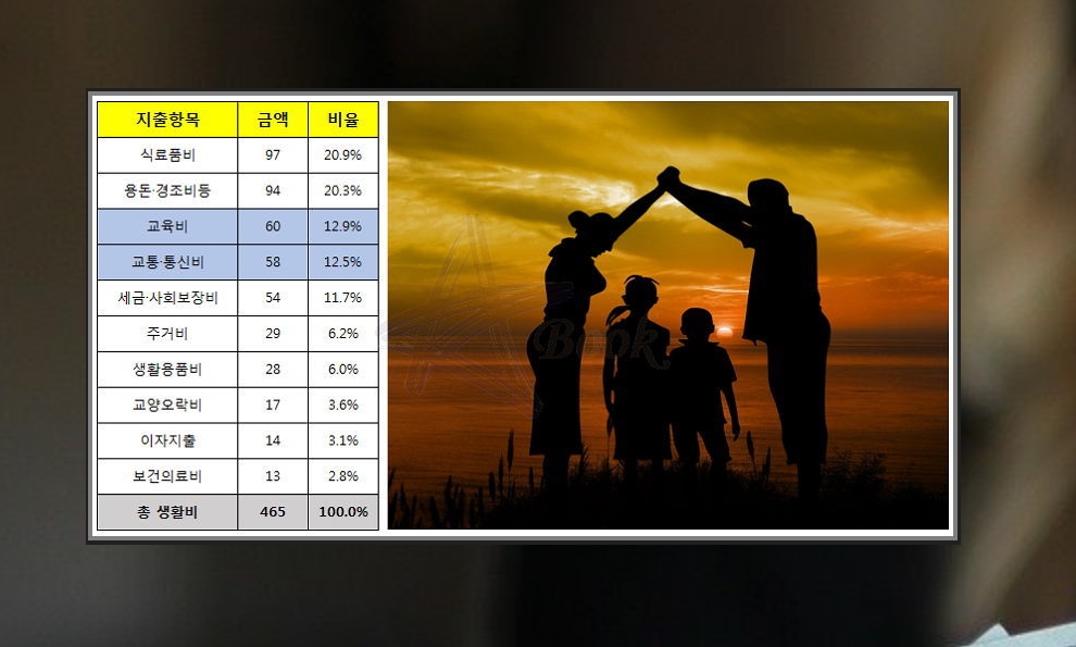 보시는 것처럼 사람마다 벌어들이는 수입과 형편이 다르기 때문에 금액은 크게 의미 없습니다. 이보다는 비율이 중요한데요. 식료품비나 용돈, 경조사비는 조율이 어려운 부분이라 논외로 치고, 교육비와 교통·통신비가 뜻밖에 많은 비율을 차지하고 있습니다. 4인가족 한달 생활비를 줄이고 싶다면 다음을 참고해주세요.