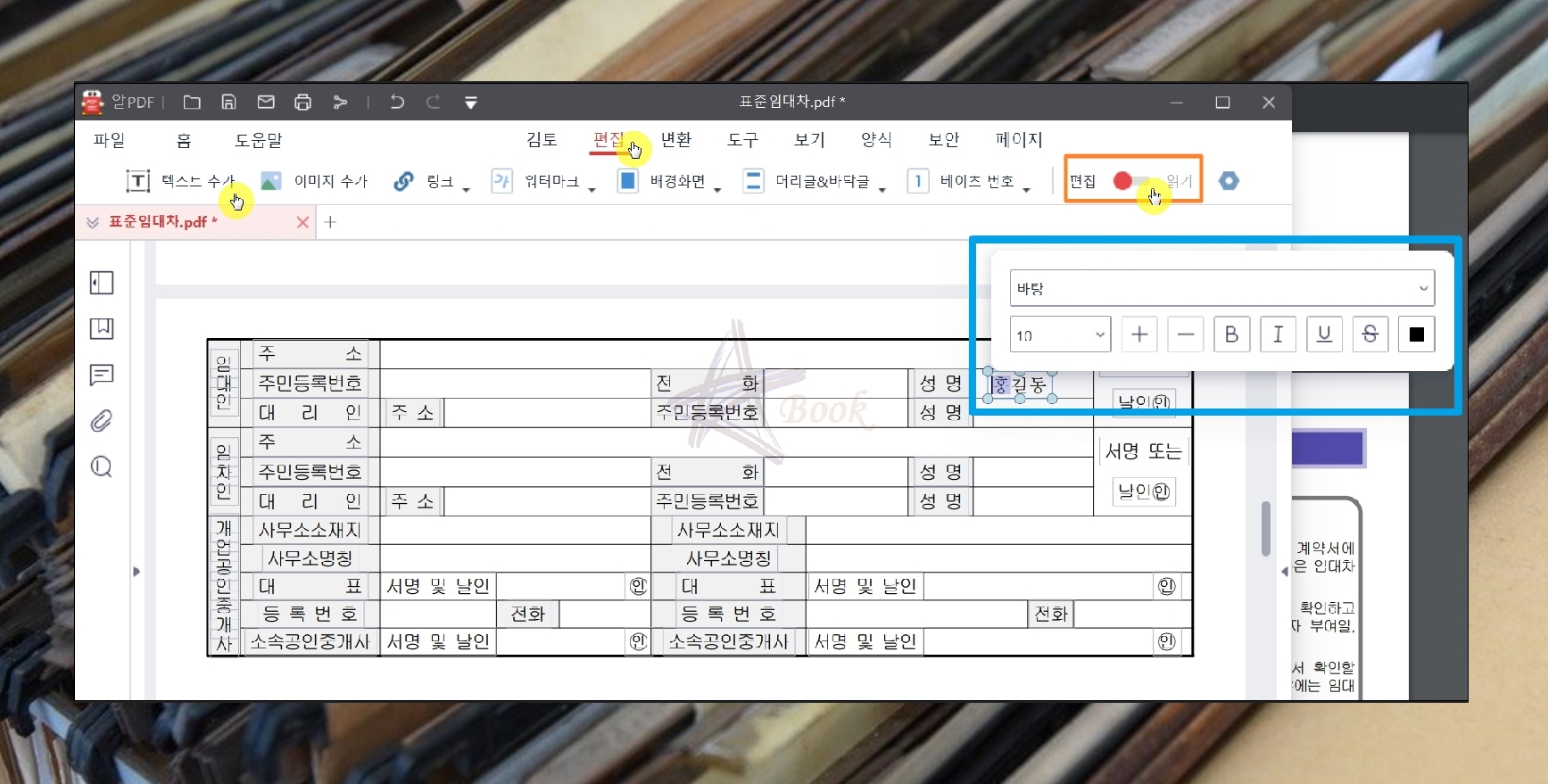 그럼 본격적으로 문서 내용을 변경하는 기능을 이용해 보도록 하겠습니다. 메뉴에 있는 편집 버튼을 클릭해 보세요. 그럼 다음과 같이 기존에 있는 텍스트 부분을 수정할 수 있습니다. 텍스트 수정을 할 때에 폰트, 글자 크기, 굵기 등 원하는 모습으로 텍스트를 입력하는 것이 가능해요. 이외에도 이미지 추가, 링크, 워터마크, 배경화면 등 다양한 것을 추가 할 수 있습니다. 참고로 프로그램 상단에 보면 편집과 읽기를 선택하는 체크박스가 있는데요. 여기에 "편집"으로 선택이 되어 있어야 합니다.