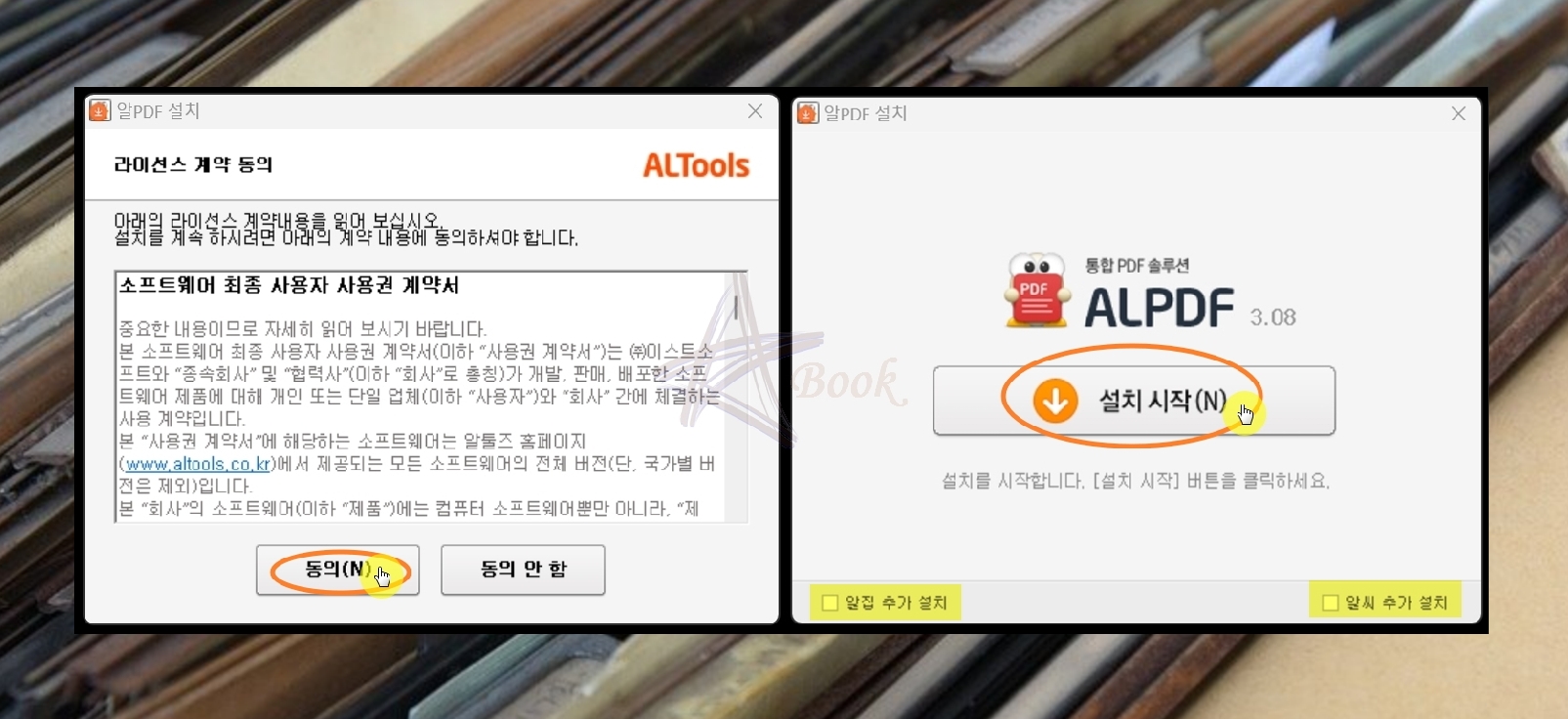 다음은 설치 파일을 실행한 화면인데요. 계약서를 읽어 보고 동의 버튼을 눌러주세요. 그다음 설치 시작 버튼을 눌러주면 무료 pdf 편집 프로그램에 대한 설치가 시작됩니다.