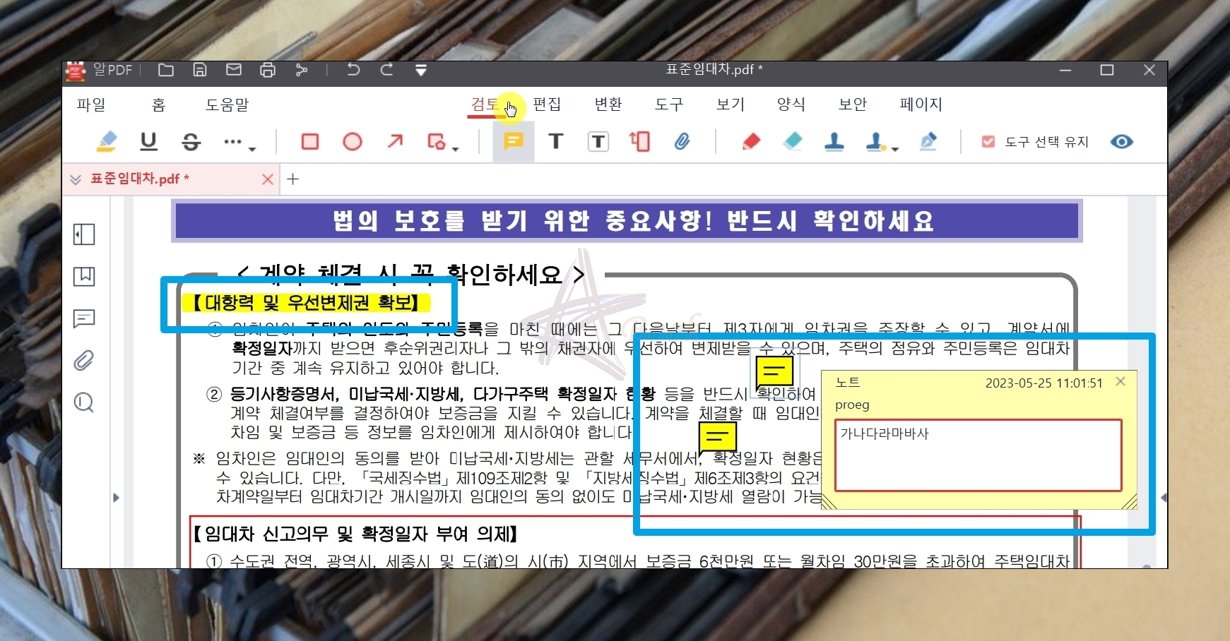 메뉴에서 검토 버튼을 선택해 보세요. 그럼 하이라이트, 도형, 댓글 등 기존 문서에 의견을 표시할 수 있는 기능을 무료로 사용할 수 있습니다. 하고자 하는 작업을 완료 하였다면 프로그램에서 내보내기 버튼을 눌러 다시 저장을 하면 됩니다.