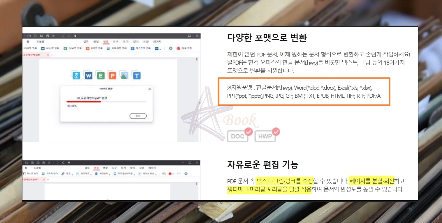 이번 시간에 사용법을 알려드릴 프로그램의 경우에는 마이크로 오피스의 문서(doc, xls, ppt)는 물론이고, 아래아 한글 문서(hwp)로의 변환을 무료로 할 수 있습니다. pdf 문서를 구성하는 페이지나 텍스트에 대한 수정을 자유자재로 할 수 있는데요. 업무 효율을 높여 주는 워터마크, 머리글, 꼬리글을 일괄 적용 기능도 제공하고 있습니다.