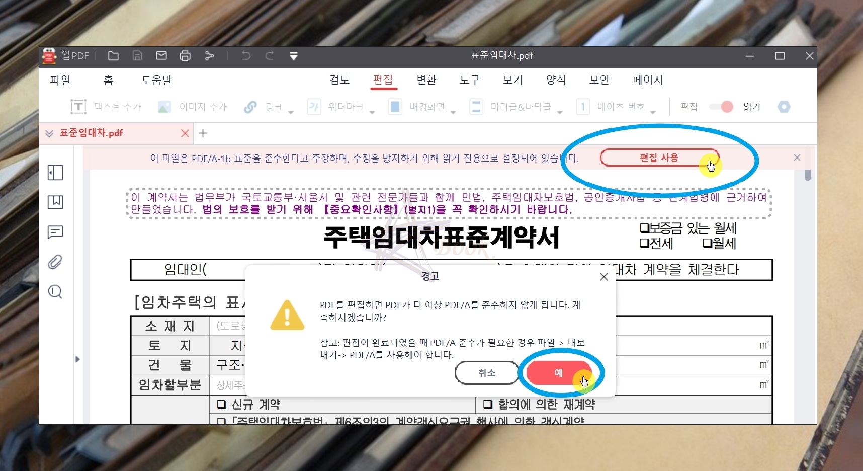 처음에 pdf 파일을 열면 편집 사용을 할 것인지 물어보는 안내 문구가 나타나는데요. 여기에서 [편집 사용] 버튼을 눌러 주세요. 그 다음 경고 문구에서는 "예"를 선택하면 됩니다. pdf/A를 준수하지 않게 된다고 하는데, 수정을 완료한 이후에 내보내기 기능을 이용하면 pdf/A 사용이 가능합니다.