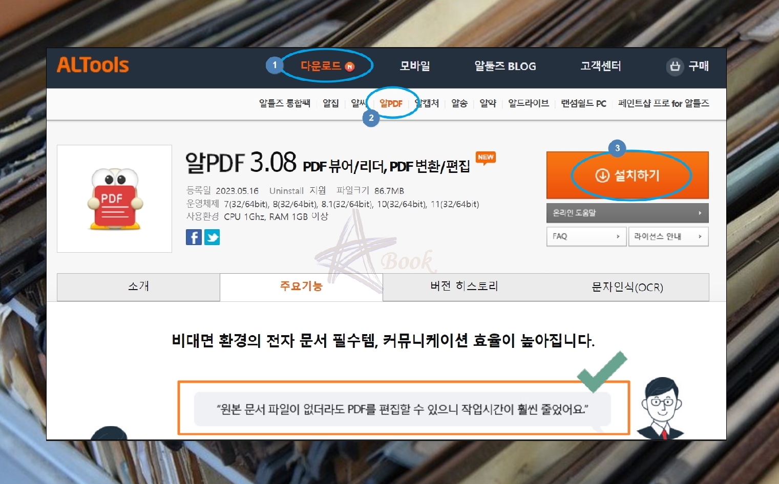 알툴즈 사이트에 접속하면 메뉴에 있는 [다운로드]를 선택해 보세요. 그럼 여러 가지 프로그램으로 구성된 하위 메뉴가 나타납니다. 여기에서 네 번째에 위치한 알pdf를 선택해 주세요. 새롭게 이동한 페이지에 접속하게 되면 우측 상단 부분에 설치하기 버튼이 있습니다. 해당 버튼을 눌러 설치 파일을 내려받아 실행해 주세요. 안내 부분에 있는 주요 기능 내용을 보면 원본 문서 파일이 없어도 pdf 편집을 할 수 있다고 합니다.