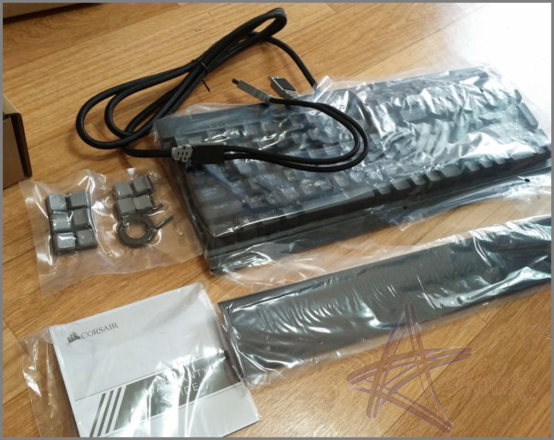 기계식 키보드 본체와 몇 가지 교체 버튼, 설명서, 손목 받침대가 전부에요.