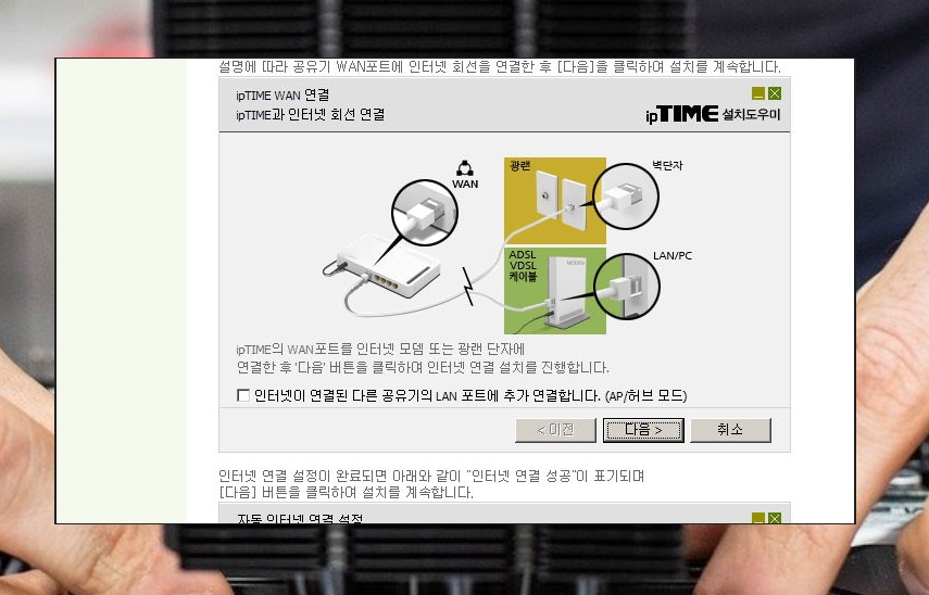 방금 다운로드 받은 iptime 공유기 설치도우미 프로그램을 실행하면 위와 같이 상세한 내용과 함께 설치가 진행되기 때문에 안내에 따라 기기를 조작 및 연결하거나 관련 버튼을 클릭해 주시면 돼요.