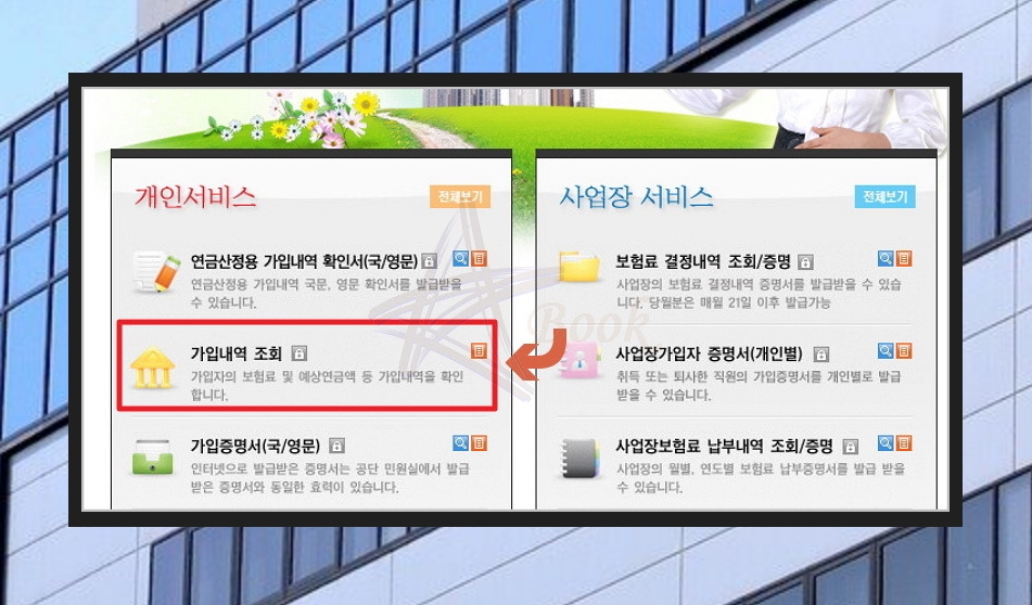 이전단계에서 가입증명서를 눌렀다면 주민번호 입력과 함께 공인인증서로 로그인해야 하는데요. 인터넷 뱅킹할 때 사용하는 인증서를 사용하시면 됩니다. 그럼 위와 같이 국문 또는 영문으로 된 재직증명서를 열어보실 수 있어요.