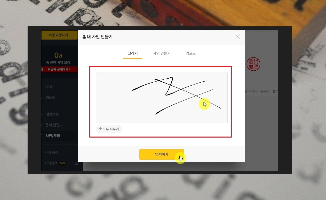 이곳에서는 온라인 사인 만들기 서비스도 제공하고 있습니다. 마우스로 본인이 사용하는 사인을 그린 후 [입력하기] 버튼을 클릭하면 됩니다. 설명을 자세하게 해서 과정이 길어 보일 수 있지만, 직접 해보면 꽤 짧은 시간에 온라인 도장 제작이 가능합니다.