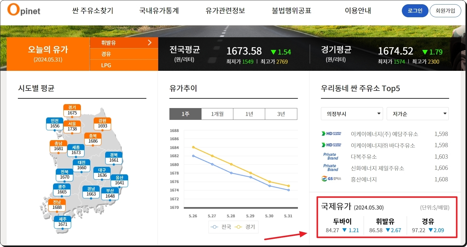Opinet 사이트에 접속했습니다. 홈페이지 메인화면을 보면 "오늘의 시세"를 시작으로, 전국평균, 경기평균, 시도별 평균, 추이, 우리동네 싼 주유소가 나타납니다. 맨 우측 아래에는 이번 시간에 중점적으로 알아볼 국제유가 정보도 표시되어 있어요.