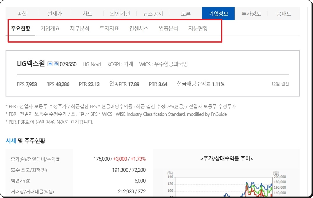 마지막으로 차트 아래를 보면 여러 가지 메뉴를 선택할 수 있도록 되어 있는데요. 특정 종목에 대하여 깊이 있게 알아보고 싶을 때 이용하면 좋습니다. 기업정보의 경우 기업개요, 재무분석, 투자지표, 컨센서스, 업종분석, 지분현황과 같이 다각도로 상세하게 알아볼 수 있어요.
