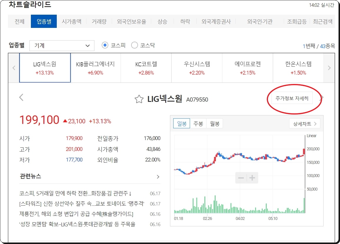 표에서 [차트 슬라이드]를 클릭해 보세요. 그럼 같은 업종이나 시가총액, 거래량 등 유사한 성격을 가진 종목끼리 묶어서 시세를 볼 수 있도록 해줍니다. 자동으로 하나의 종목씩 차트와 뉴스, 현재가 등을 확인할 수 있죠. 관심 있는 업종이 있는 경우 차트 슬라이드를 잘 활용해 보세요.