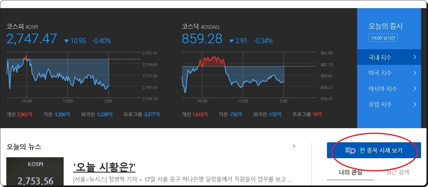 본격적으로 다음증권 사이트 이용 방법에 대해 알려드리겠습니다. 일단 다음 포털 사이트에 접속해 주세요. 그 다음 검색창 아래에 있는 "증권" 메뉴를 선택합니다. 가장 먼저 각 나라의 주요 지수가 나타나는데요. 각 주식의 흐름에 영향을 주기 때문에 매일 지수의 흐름을 살펴볼 필요가 있습니다. "오늘의 증시" 카테고리 아래에 있는 [전 종목 시세 보기]를 클릭해 보세요. 그럼 한 번에 많은 주식시세를 볼 수 있는 페이지가 열립니다.