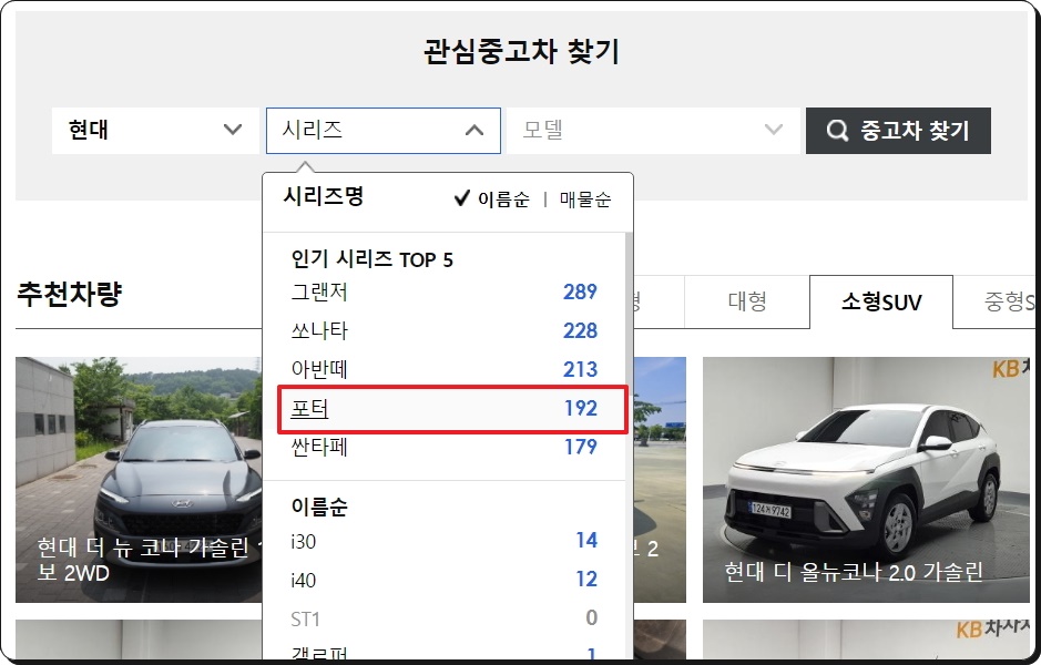 관심 중고차 찾기가 나타나는데요. 브랜드와 시리즈, 모델을 순서대로 입력합니다. 아무래도 1톤 트럭의 경우에는 현대 포터가 매물이 많은 편이에요. 시세를 볼 수 있는 물량이 많아야 시세 파악이 용이하고 당연히 원하는 1톤트럭을 찾기가 수월하죠.