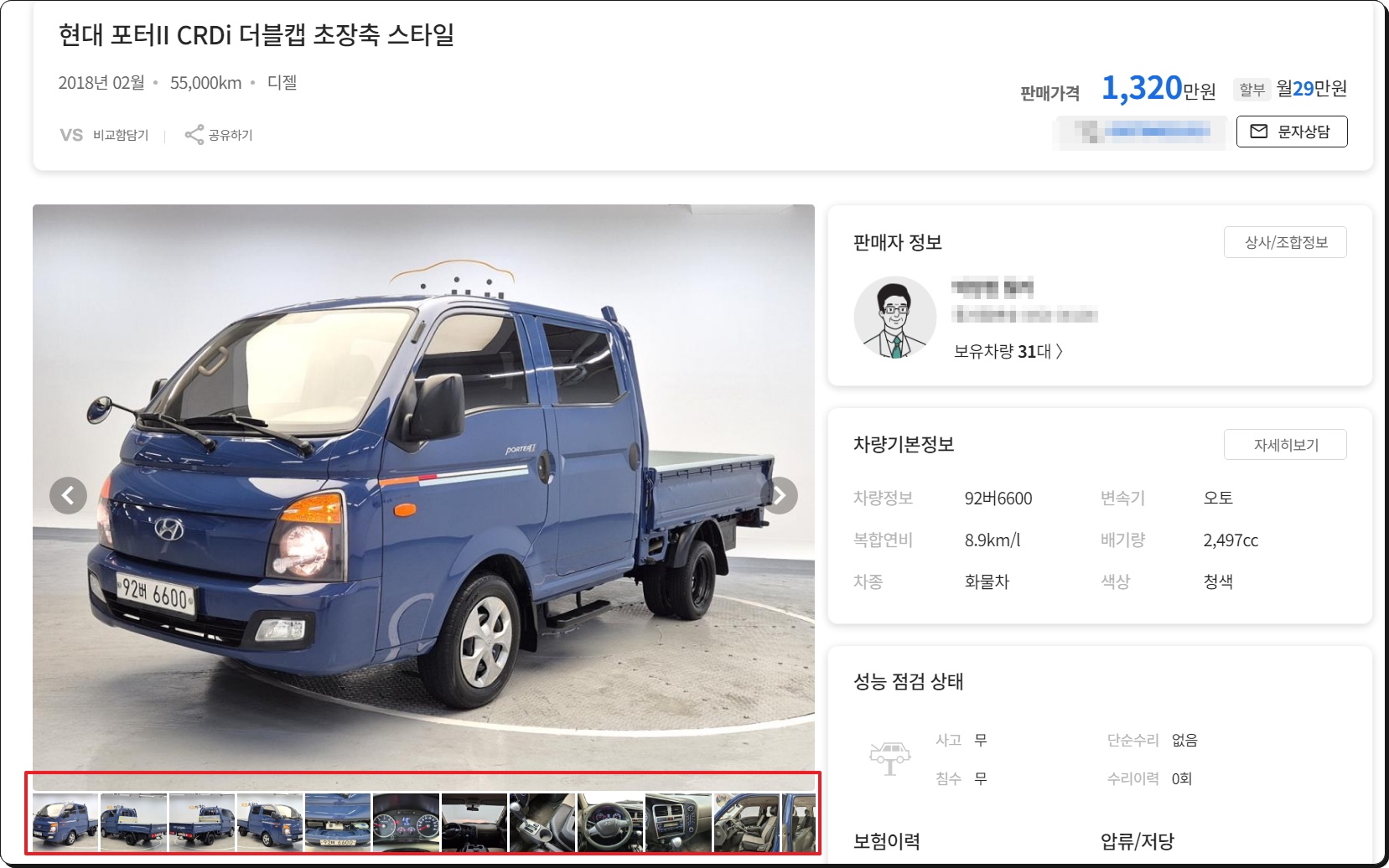 저는 현대 포터2 CRDI 더블캡 초장축 스타일을 선택했는데요. 판매 가격이 1,000만 원 초반이지만, 주행거리가 크지 않다는 점에서 마음에 듭니다. 변속기도 오토이기 때문에 수동 기어보다 편하게 운전할 수 있죠. 추가적으로 사고나 침수, 단순 수리가 없다는 점이 마음에 듭니다. 사진 자료도 많이 올라와 있기 때문에 구석구석 살펴볼 수 있어요. 물론 1톤 트럭 중고차를 구매할 때는 실물로 한 번 더 확인할 필요가 있습니다.