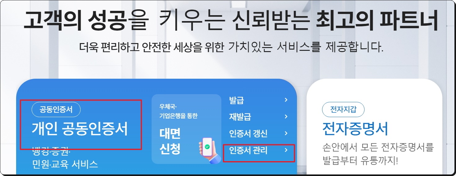 사이트에 접속하면 본인이 사용하는 공동인증서에 대한 종류를 선택해 주세요. 그다음 [관리 메뉴]를 선택합니다. 화면에 보면 발급이나 갱신, 재발급 신청, 결제와 같은 메뉴가 있는데요. 이것을 뒤로한 채 사이트 맨 우측에 있는 [관리 메뉴]를 선택합니다.