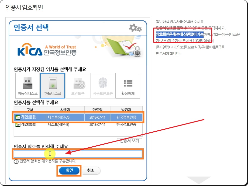 이곳에서 진행하는 암호 확인은 횟수와 상관없이 계속 입력이 가능합니다. 비밀번호의 경우 영문(대소문자 구분)과 숫자를 조합한 10자리 이상의 문자열에 해당합니다.