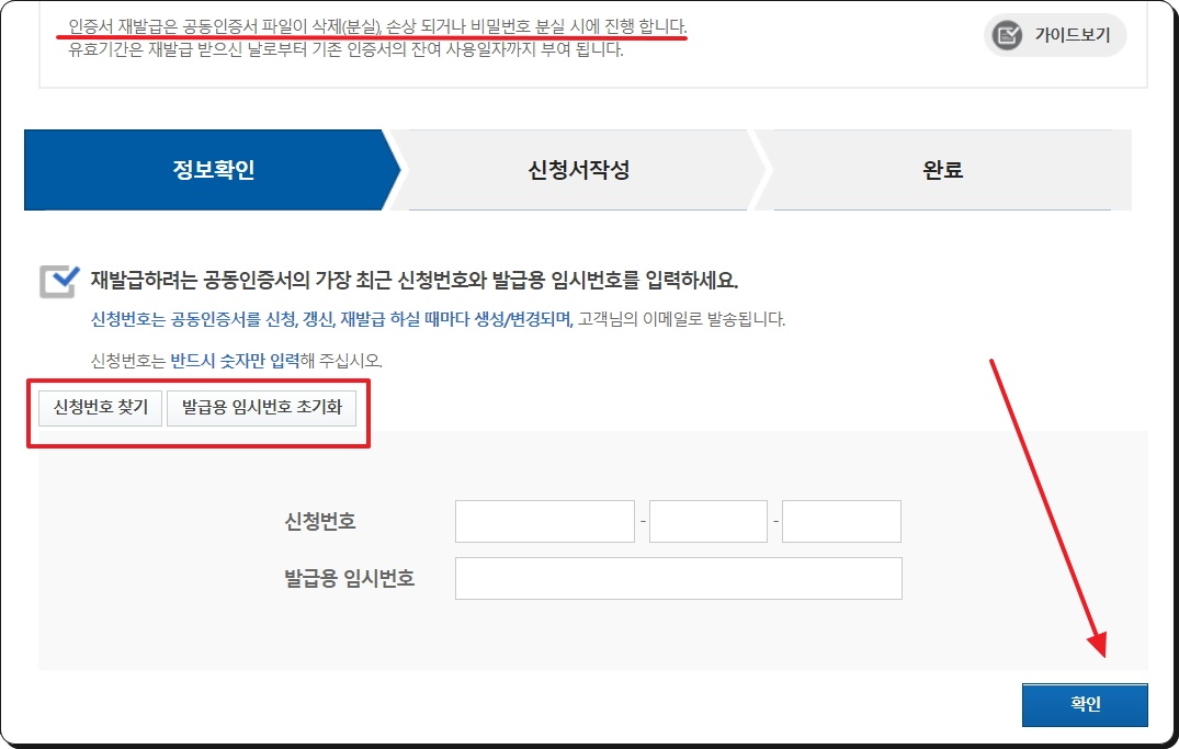 자신이 주로 사용하던 비밀번호를 수없이 많이 입력을 했음에도 불구하고, 공동인증서 비밀번호 찾기에 실패했다면 최후의 수단을 사용해야 합니다. 바로 재발급 방법인데요. 해당 사이트에서 재발급 메뉴를 선택한 후 안내에 따라 이용 정보를 입력하면 됩니다. 이에 따라 신청 번호와 발급용 임시 번호를 받게 되는데요. 이것을 다시 해당 사이트에 입력하여 다음 단계로 넘어갑니다. 그다음 공동인증서 신청 정보를 입력하면 됩니다.