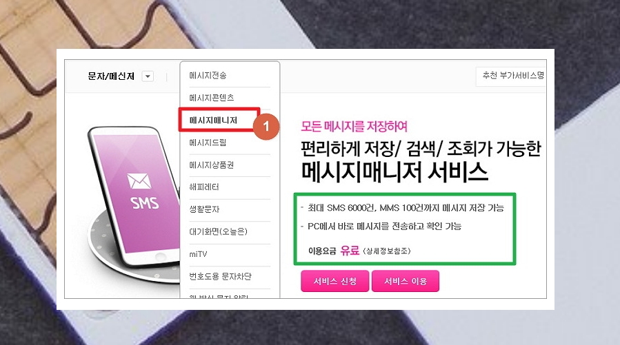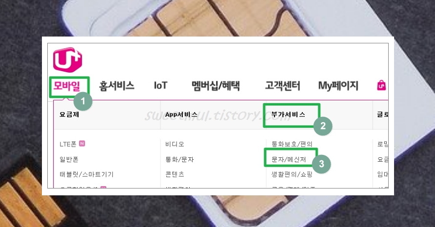 모바일 메뉴에서 보시면 부가서비스에 [문자 / 메신저]가 있답니다.