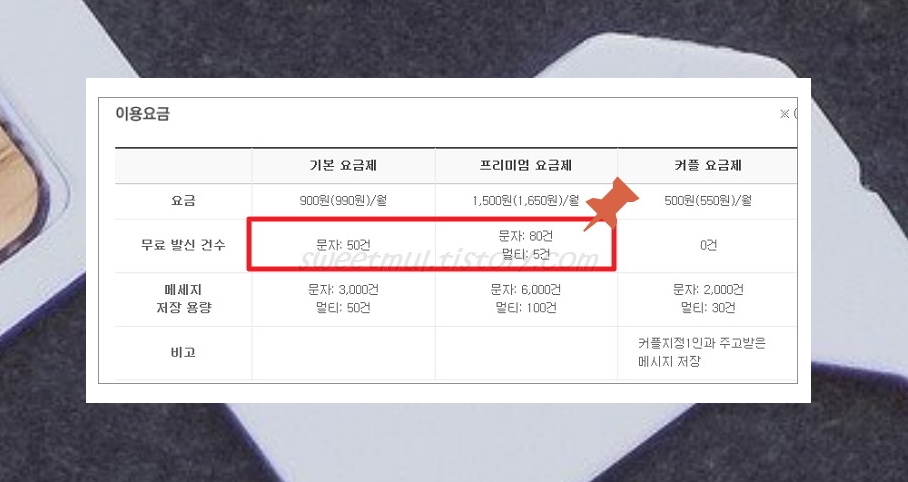 아래에 이용요금표에 문자 50건이 적혀 있네요.