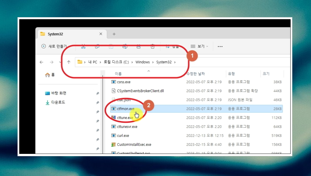 다음은 한글 자판이 제대로 인식이 되지 않는 오류를 해결해보려고 하는데요. 이 경우는 간단합니다. [내 컴퓨터]를 실행한 후 C 드라이브에 있는 윈도우 폴더를 열어주세요. 그럼 system32 폴더를 찾을 수 있는데요. 여기에 안에 들어 있는 "ctfmon.exe" 파일을 실행하면 됩니다. 그럼 키보드 자판의 한영 전환이 잘 될 거에요.