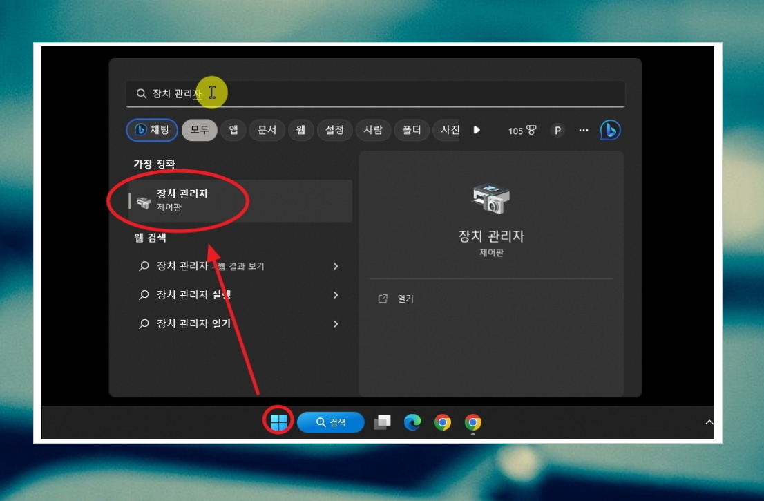 전체적으로 자판에 대한 입력 오류가 발생하는 경우에는 장치 드라이버의 문제일 가능성이 높습니다. 이러한 경우에는 제어판의 장치관리자를 통해 해결이 가능한데요. 윈도우 시작 버튼을 누른 후 "장치 관리자"를 입력하면 손쉽게 제어판의 장치관리자를 열 수 있습니다.