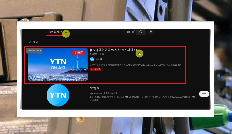.5. 유튜브 서비스에 접속하면 검색 창에 "ytn 실시간" 입력해 보세요. 그럼 여러 가지 컨텐츠가 나타나는데, 첫 번째에 있는 "[LIVE] 대한민국 24시간 뉴스채널 ytn"을 선택하면 됩니다. "실시간" 표시가 되어 있는 것에서 알 수 있듯이 현재 방영되고 있는 채널의 프로그램을 그대로 볼 수 있습니다.