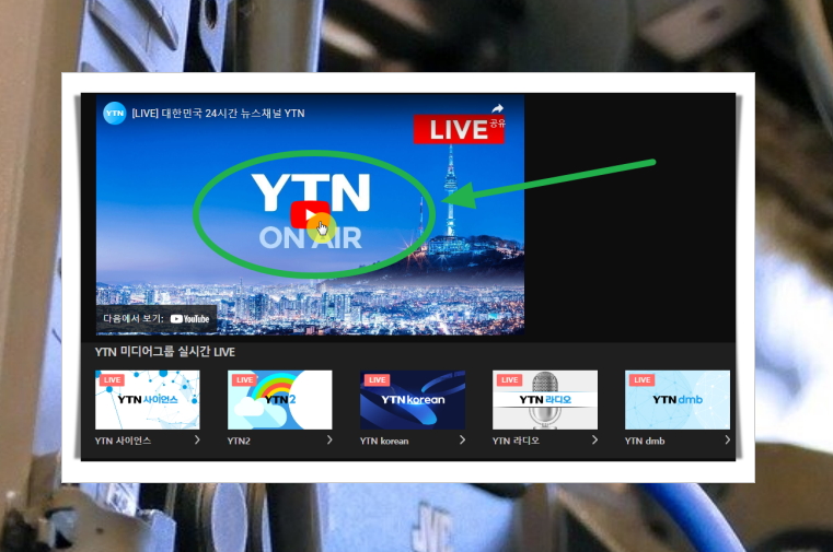 3. LIVE 페이지가 열렸습니다. ytn 온에어 표시가 되어 있는 비디오 플레이어가 보이는데요. 플레이어 중앙에 있는 재생 버튼을 클릭하면 뉴스를 24시간 시청할 수 있습니다. 아래에 보면 여러 가지 실시간 LIVE 채널 목록이 나타나는데요. 사이언스, 2tv, korean, 라디오, dmb 방송 중에서 관심 있는 분야의 채널을 선택하면 바로 보기 할 수 있어요.