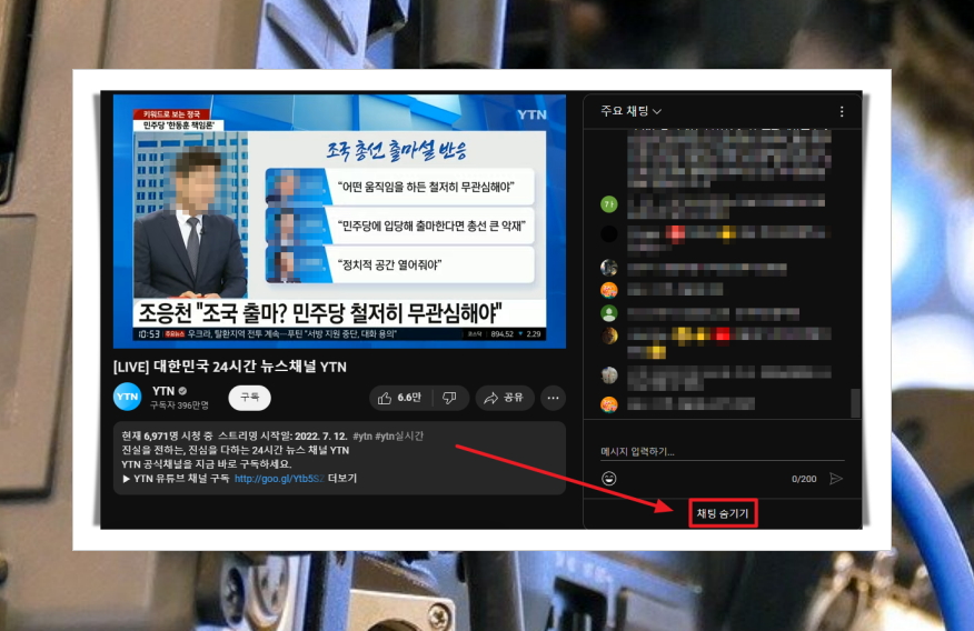 6. 두 번째 방법으로 ytn 방송을 보는 경우, 같이 시청하는 사람들과 채팅을 통해 의견을 나눌 수 있다는 장점이 있습니다. 같은 생각을 가진 사람도 많지만, 반대되는 생각도 가진 사람이 많기 때문에 재미있으면서도 스트레스를 받기 쉬운데요. 채팅 끄고 보기 가능하오니 자신의 취향에 맞게 설정해 놓고, 실시간 뉴스 서비스를 이용해 보세요.
