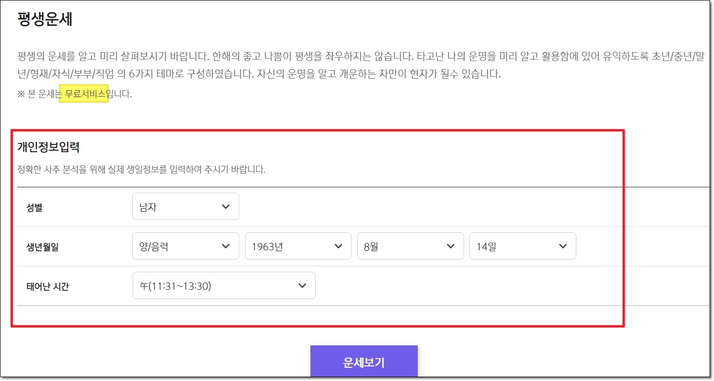 평생운세 서비스를 이용하기 위해서는 자신의 성별, 생년월일, 태어난 시간을 정확하게 입력해야 합니다. 이를 통해 자신의 운명을 정확하게 알아낼 수 있죠. 참고로 사주풀이 사이트를 통해 한 해의 운세를 보고 싶으면 토정비결을 보면 되고, 나의 일생 전체에 대해 알아보고 싶다면 "평생운세"를 보면 좋습니다.