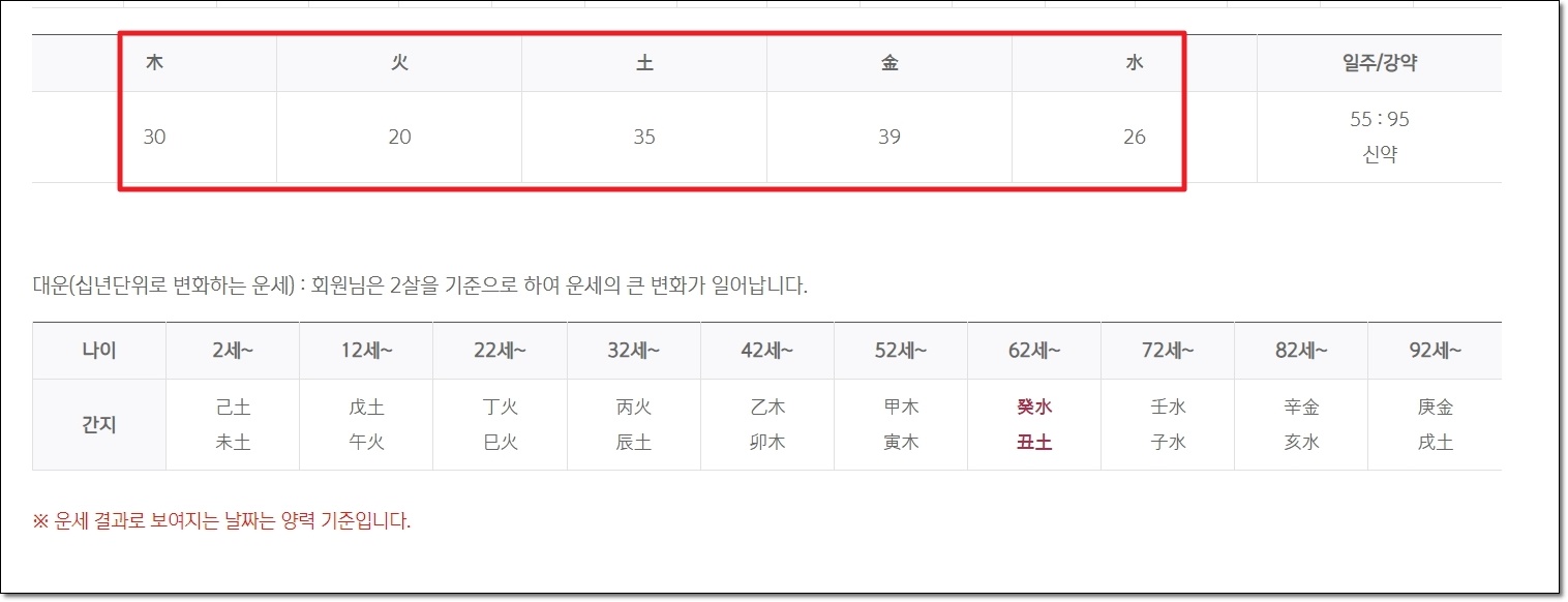 대운 다음부터는 이렇게 상세한 사주풀이 결과를 무료로 볼 수 있는데요. 초년운은 태어나서 21세까지에 해당하는 운세를 이야기 하고, 중년운은 22세부터 51세 사이, 말년운은 52세 이후에 해당한다고 합니다. 무료 사주풀이 사이트를 이용해보면 아시겠지만, 운도 나이에 따라 계속 바뀐답니다.