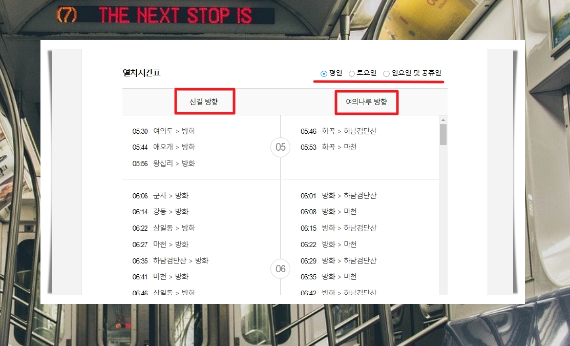8. 노선표와 함께 서울 지역의 열차 시간표도 확인할 수 있는데요. 여의도역을 중심으로 신길 방향과 여의나루 방향 열차에 대하여 몇 시에 도착하는지 알 수 있습니다. 평일, 토요일, 일요일 및 공휴일 구분이 되어 있으니 참고해 주세요.